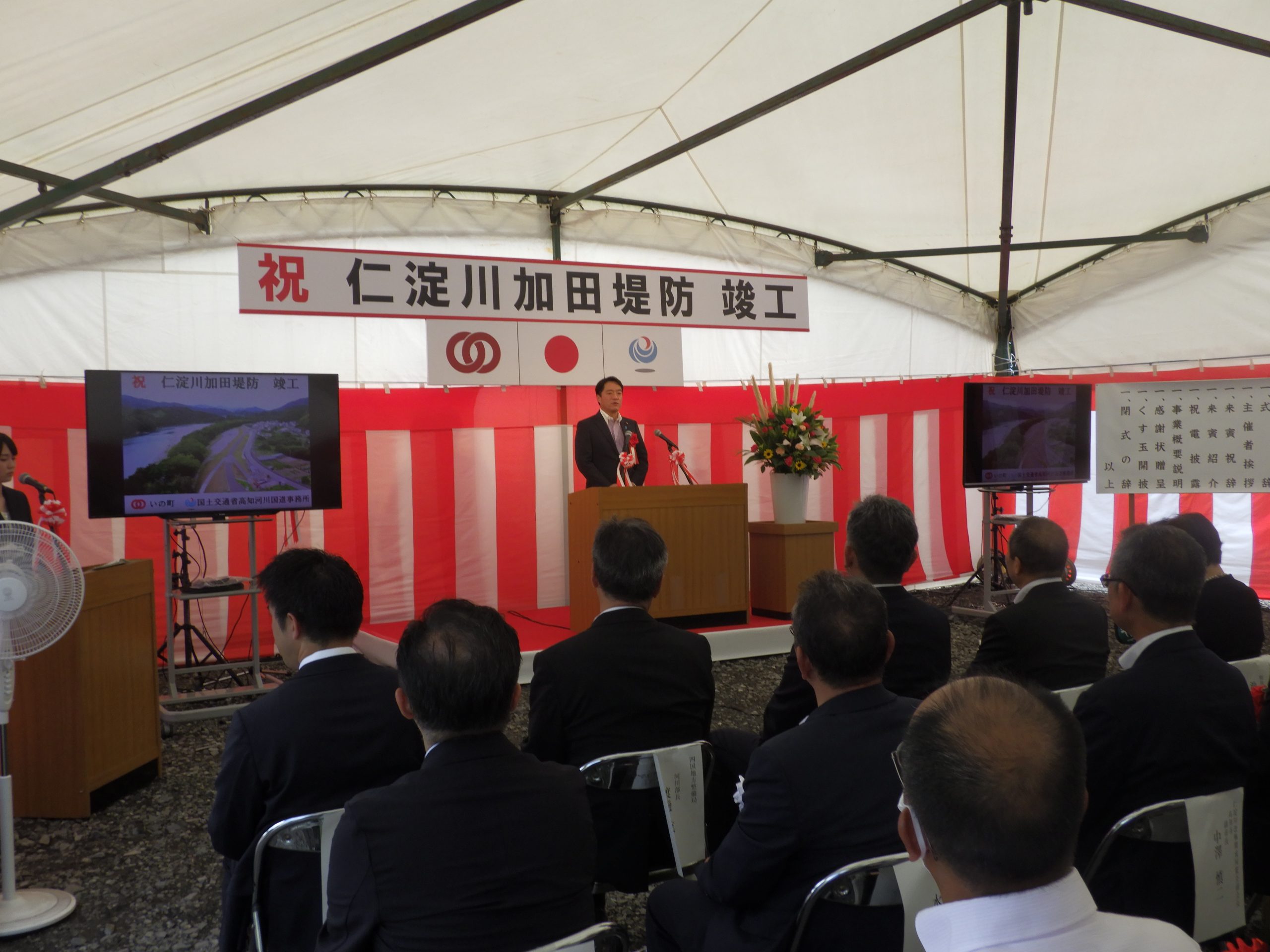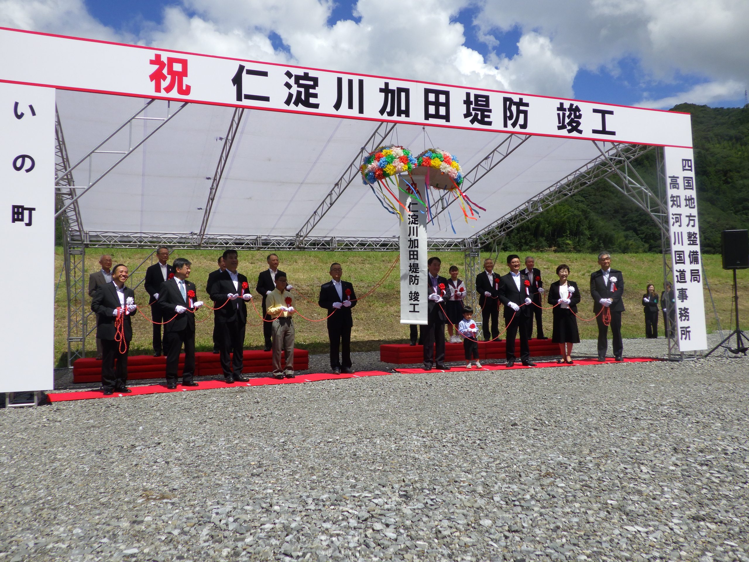 第一コンサルタンツが道路管理者との協議内容を踏まえた修正設計や堤防に隣接する関連施設の設計を担当させていただいた「仁淀川加田堤防」の竣工式が、8月27日に現地で開催されました。弊社からは右城社長、青木常務、営業課の井上主任が出席しました。