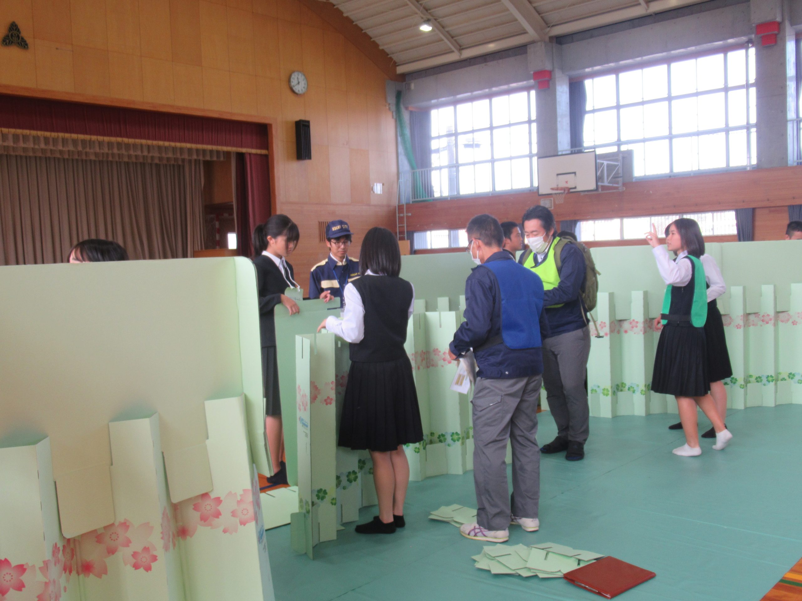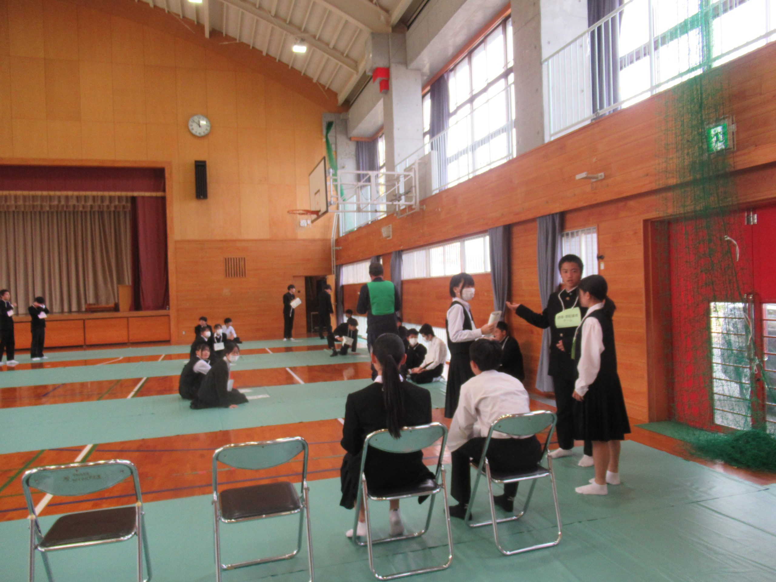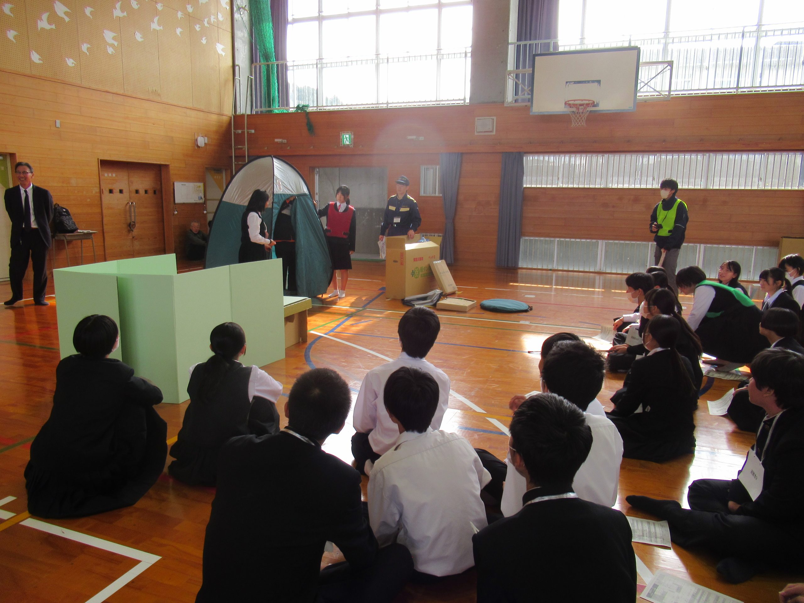 訓練では、災害の発生時に避難所の開設をできるよう、介良中学校の3年生が避難所運営役や避難者役に分かれて、段ボールパーティションや簡易トイレの組み立て、避難者の受け入れ・誘導などを行いました。