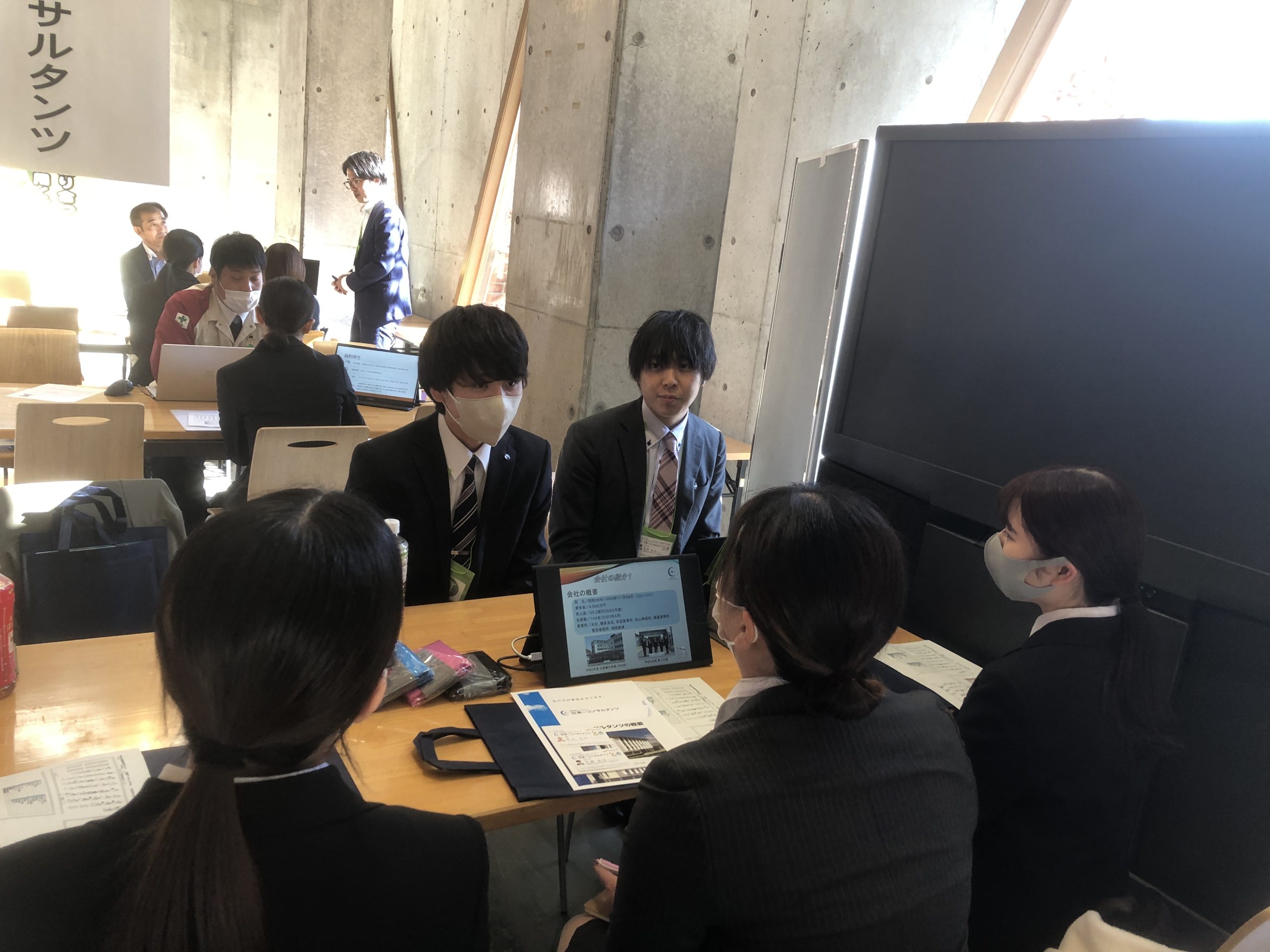 開会のご挨拶の後、参加学生が約3時間の限られた時間の中で各企業のブースを訪問していました。当社の仕事内容を知った上で訪問してくれた学生さんや今年の夏に当社にインターンに来てくれた学生さんの訪問もあり、大変嬉しく思いました。また、学生さんからの積極的な質問も多く、就職活動に対する熱心さが伝わってきました。訪問してくださいました学生の皆さんありがとうございました。