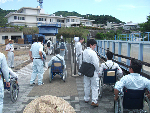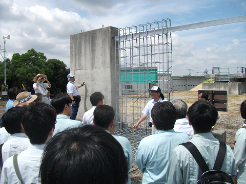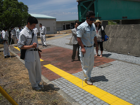 午前の部はバス車中でユニバーサルデザインについて学習後、国土交通省四国整備局四国技術事務所で土木構造物の品質確保について実習施設(実物大擁壁)によるコンクリート打設と配筋の留意点について学びました。その後、車椅子と白杖棒を使用した歩行体験コースに参加し、ユニバーサルデザインの重要性や設計の難しさなどを学習しました。