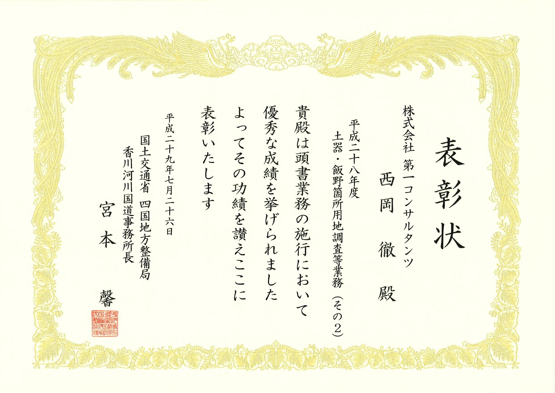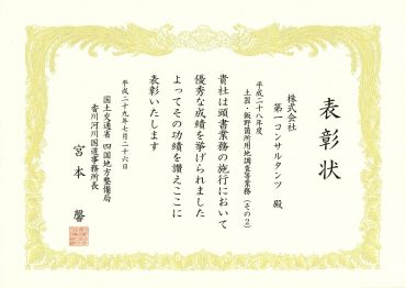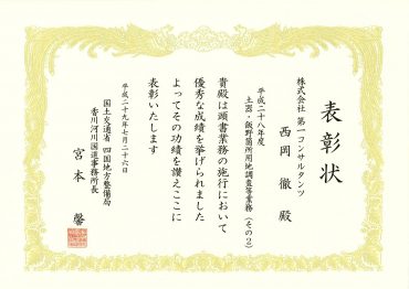 「平成28年度 土器・飯野箇所用地調査等業務」が優良業務表彰、この業務の管理技術者である西岡徹が優秀建設技術者表彰を受賞しました。