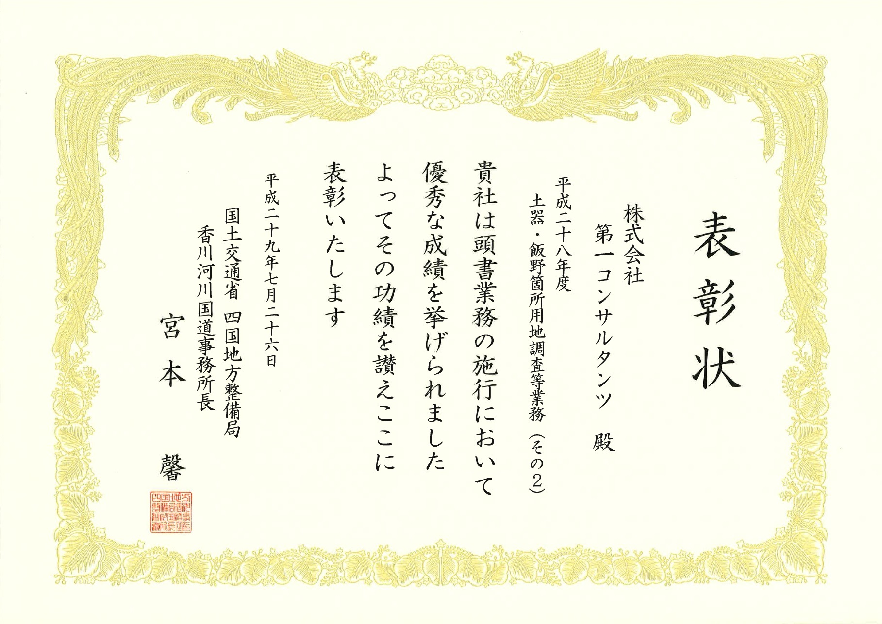 平成29年7月26日に香川河川国道事務所において平成29年度国土交通行政関係功労者表彰式があり、
