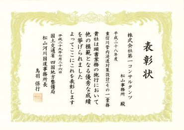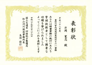 「平成28年度重信川管内浸透対策設計業務」が優良業務表彰、この業務の管理技術者である片岡寛志が優秀建設技術者表彰を受賞しました。