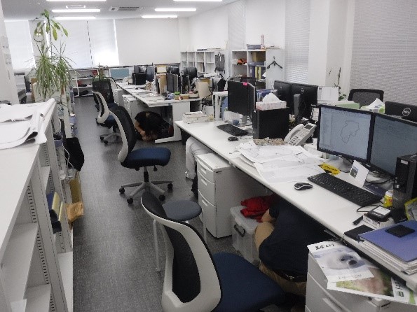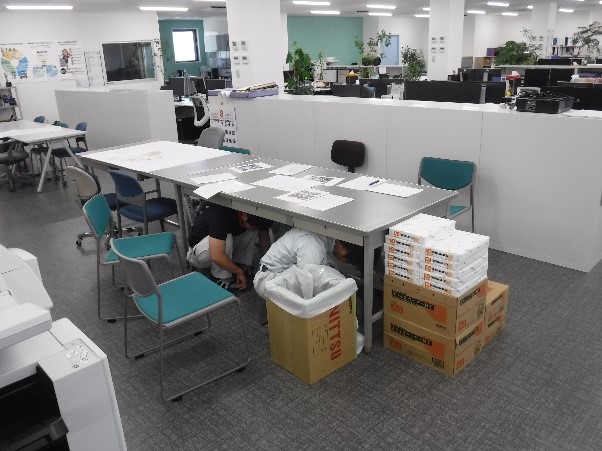 午前10時に社内放送でアナウンスし、3つの安全行動(まず低く、頭を守り、動かない)を1分間行いました。