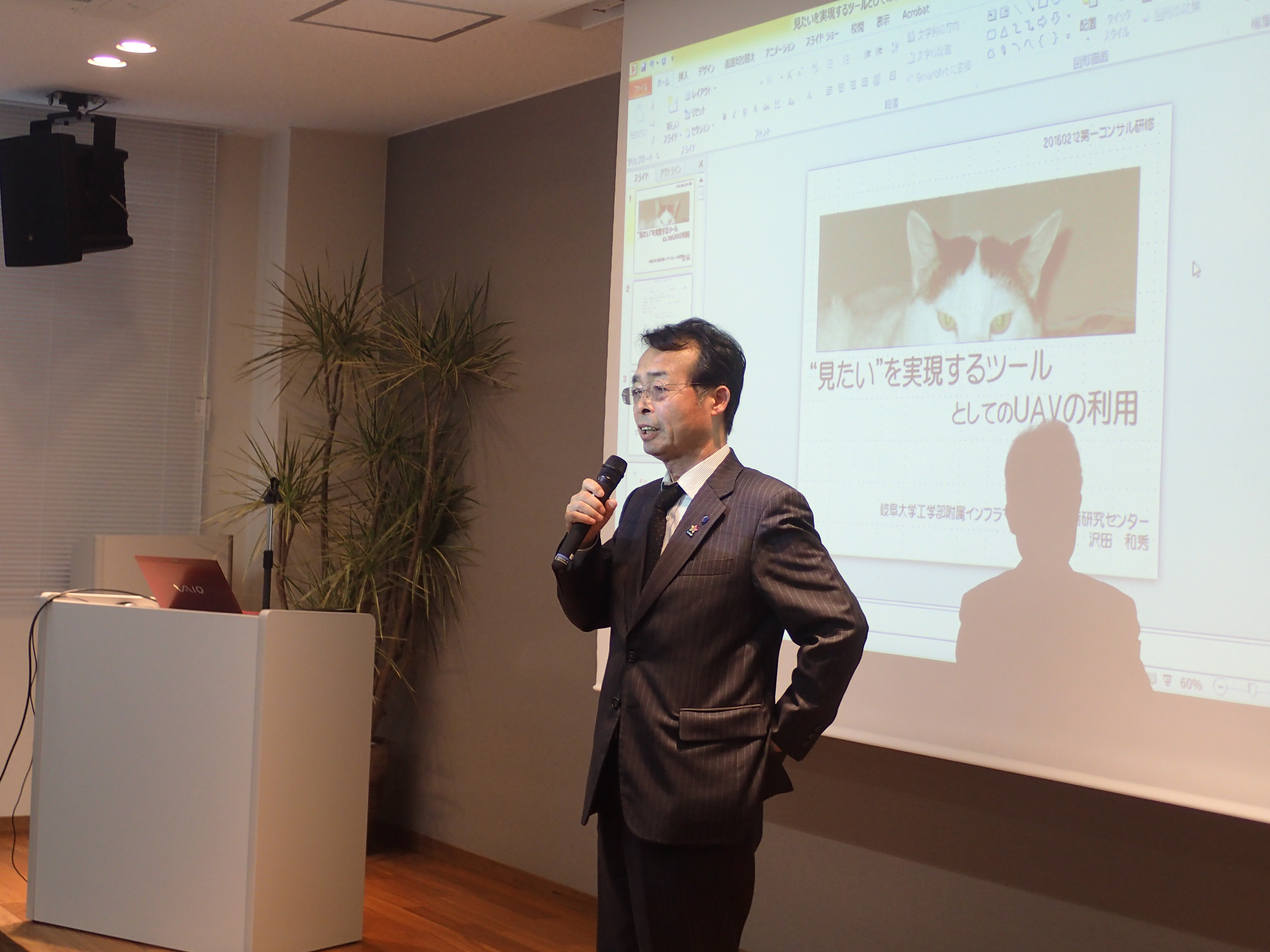 沢田教授からは、これまでの運用実績を基に、UAVに代表されるドローンを現場調査などに活用する際の問題点や事前準備の重要性などについて講演をいただきました。