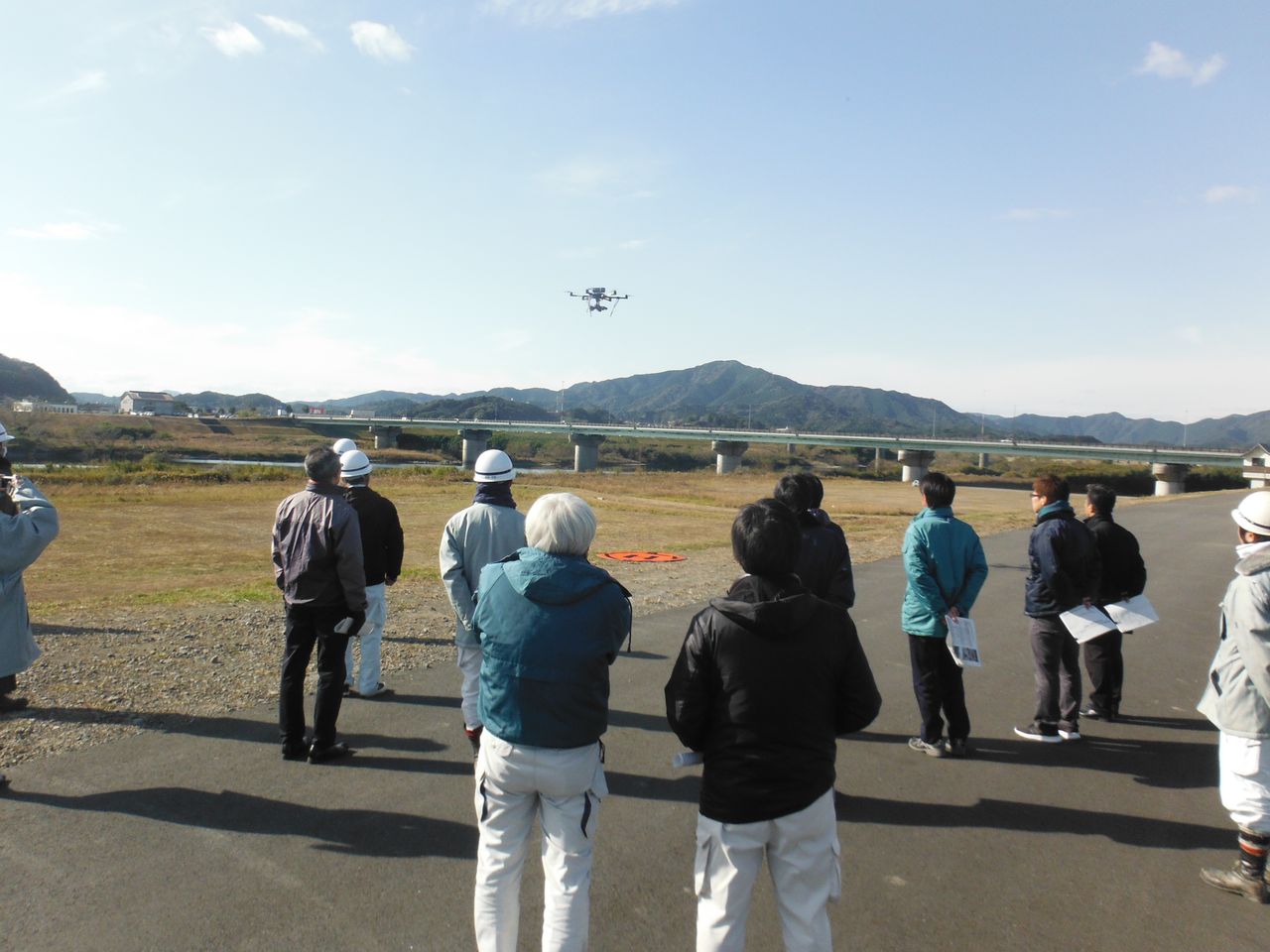 午後は、四万十川の河川敷に移動し、実際にUAV(ドローン)を飛行させての3D測量の実地研修を行いました。また、残った時間でTLSによる計測デモと職員の方3名にドローンの飛行体験をしていただきました。