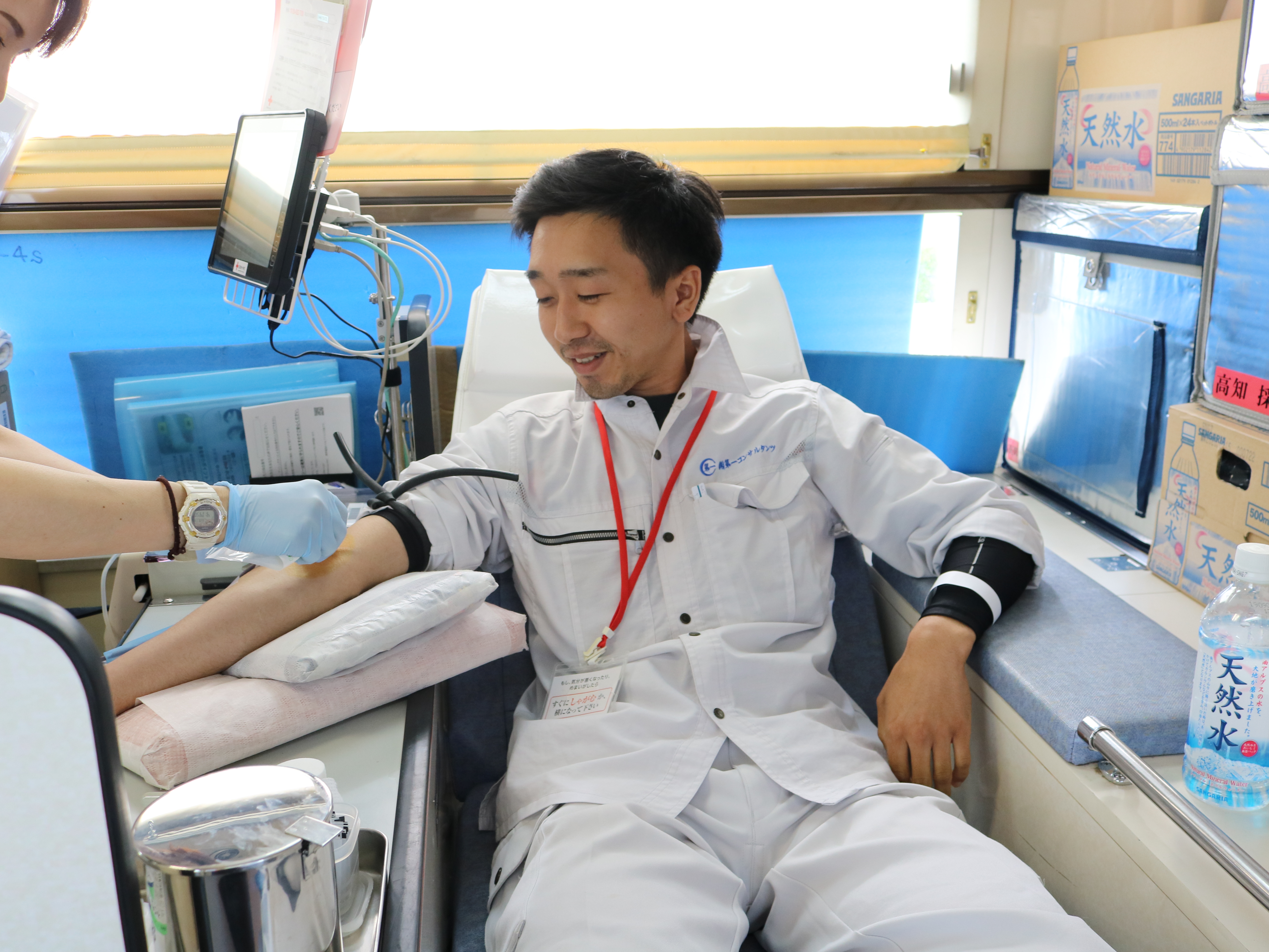 今年も高知県赤十字血液センターが行う400ml献血に協力致しました。献血参加者は本社1F研修室にて問診を受けた後、当社駐車場に停めてある献血バスに乗り込み献血を実施致しました。