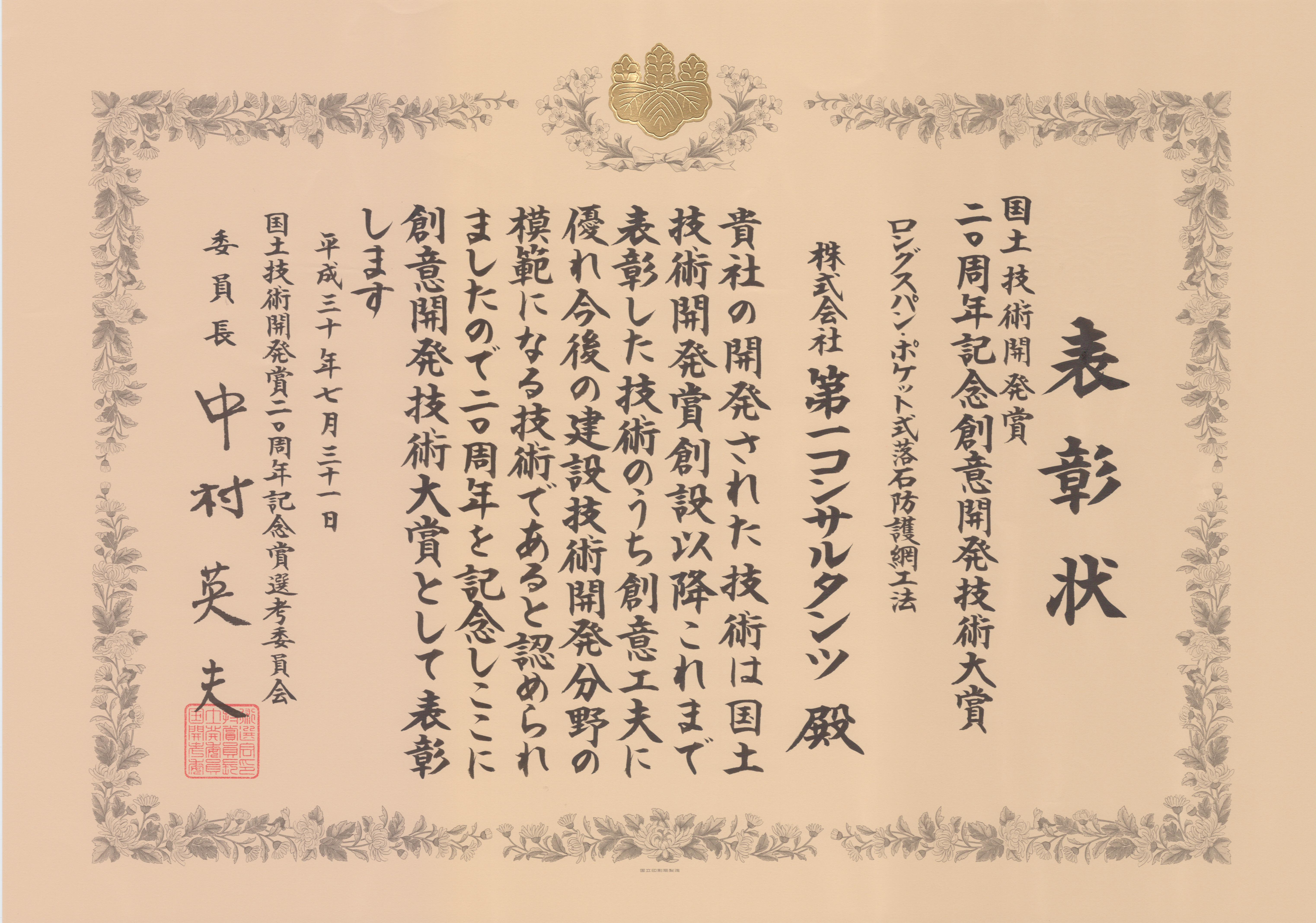 当社と株式会社田中工業が中心となって技術開発し、平成22年度に国土交通大臣表彰を受けていた「ロングスパンポケット式落石防護ネット工法」が、その後の技術の改良や活用実績、今日視点から見た社会的意義・今後の発展性等を評価して、特に優れ今後の建設技術開発分野の模範となる技術であると評価され、株式会社田中工業と共に「創意開発技術大賞」を受賞しました。