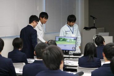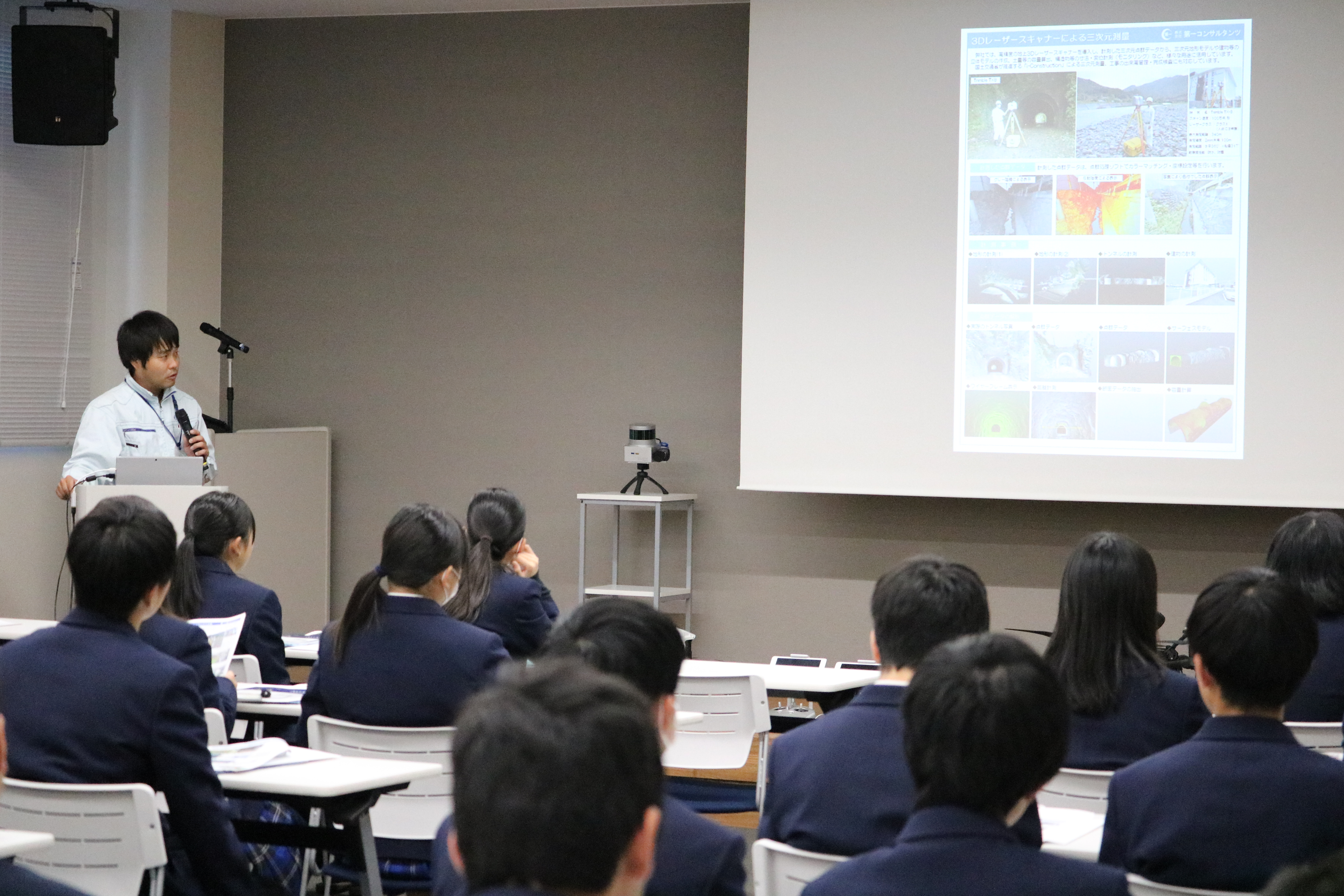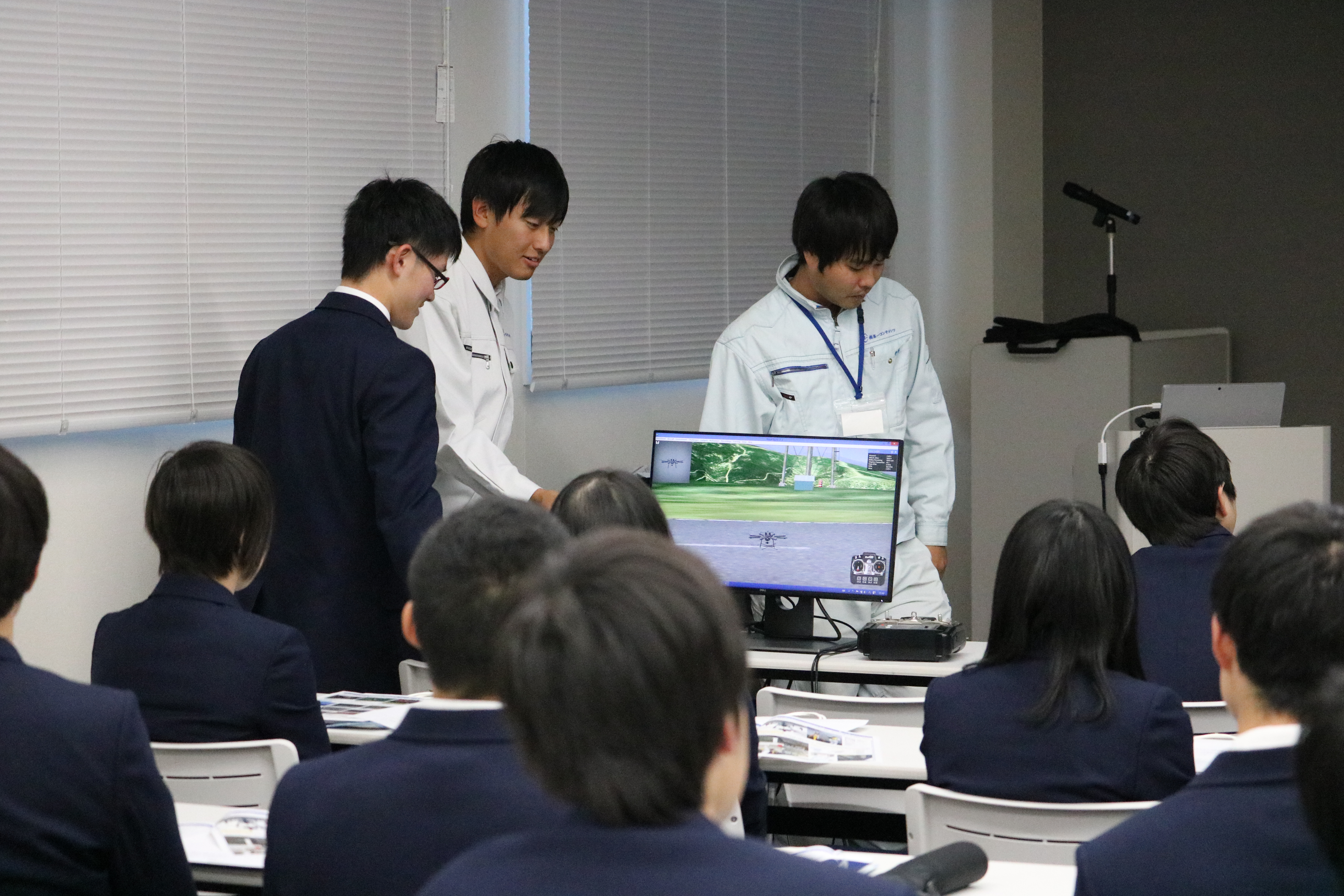 次に、調査部の伊藤(37Z)よりドローンのシミュレータの体験と3Dレーザースキャナなどの最新機器の実演をいたしました。一時間という短い時間でしたが真剣に説明を聞く学生の姿に、説明者も力が入りました。