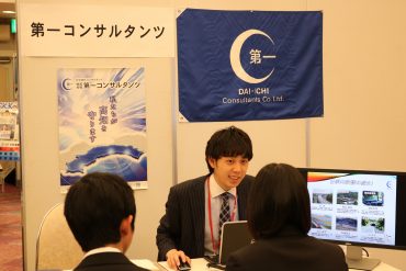各社3分間の会社紹介スピーチの後、ブースの訪問が始まりました。学生の方の中には、3分間の会社紹介スピーチで当社に興味を持ち、訪問してくださった方もおり、嬉しく思いました。