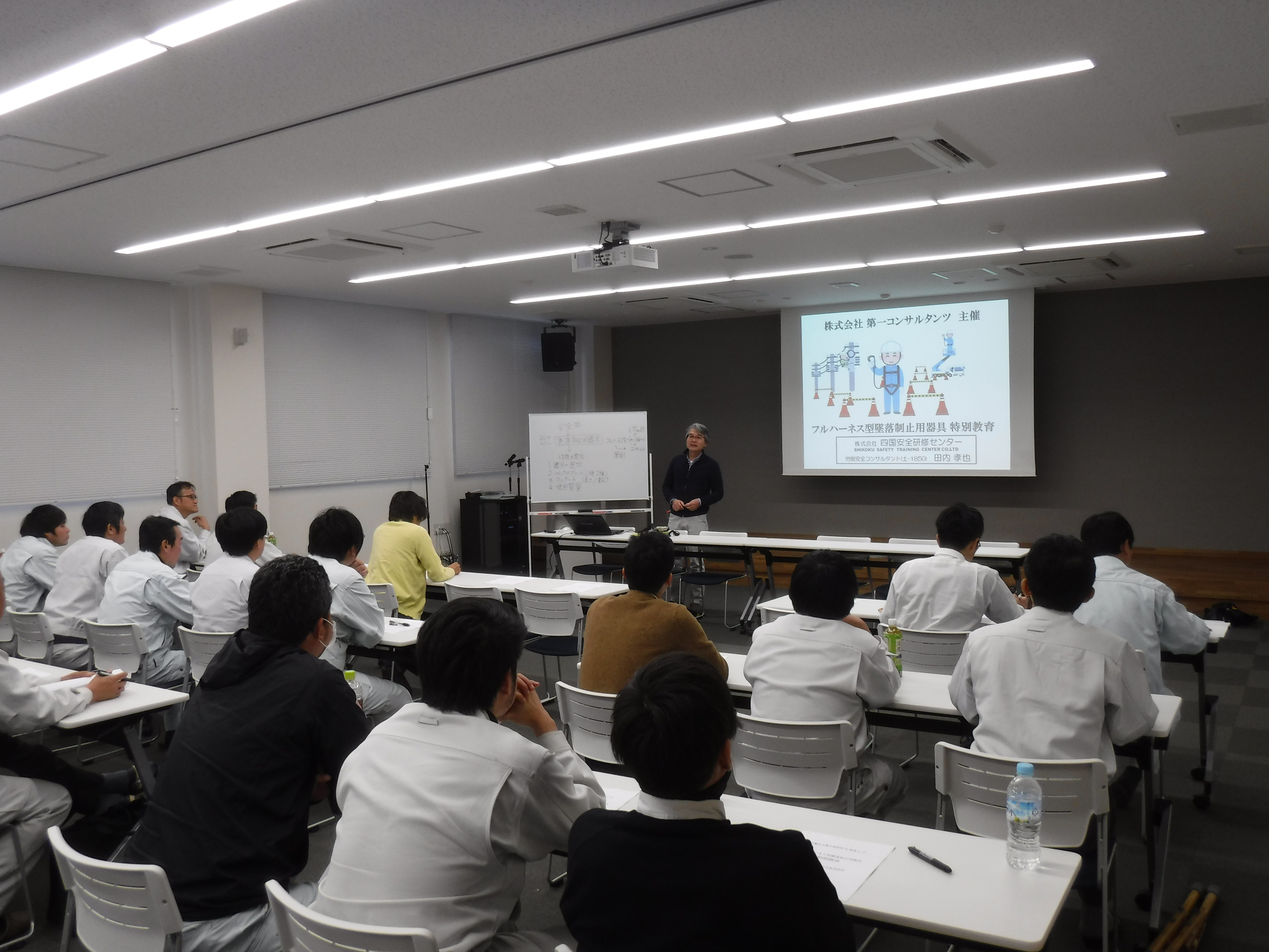 今回の講習会は、今年2月1日から安全帯の名称が「墜落制止用器具」に変わり、フルハーネス型を使用することが原則となることにより必要な安全衛生特別教育であり、四国安全研修センター代表田内様を講師に招き講習会を開催しました。