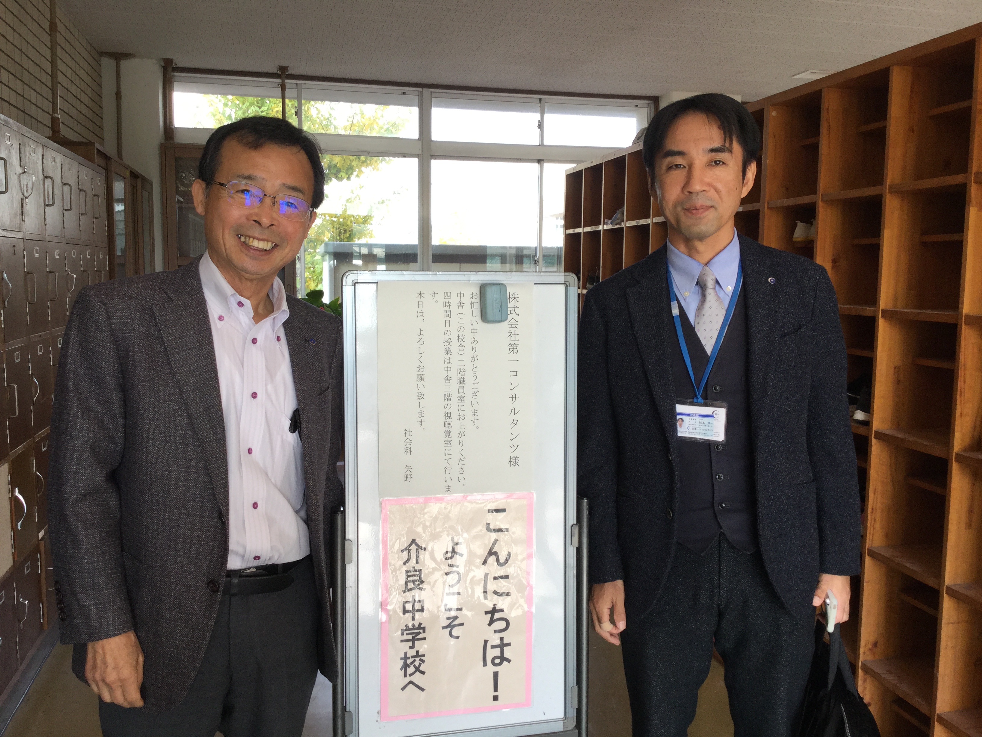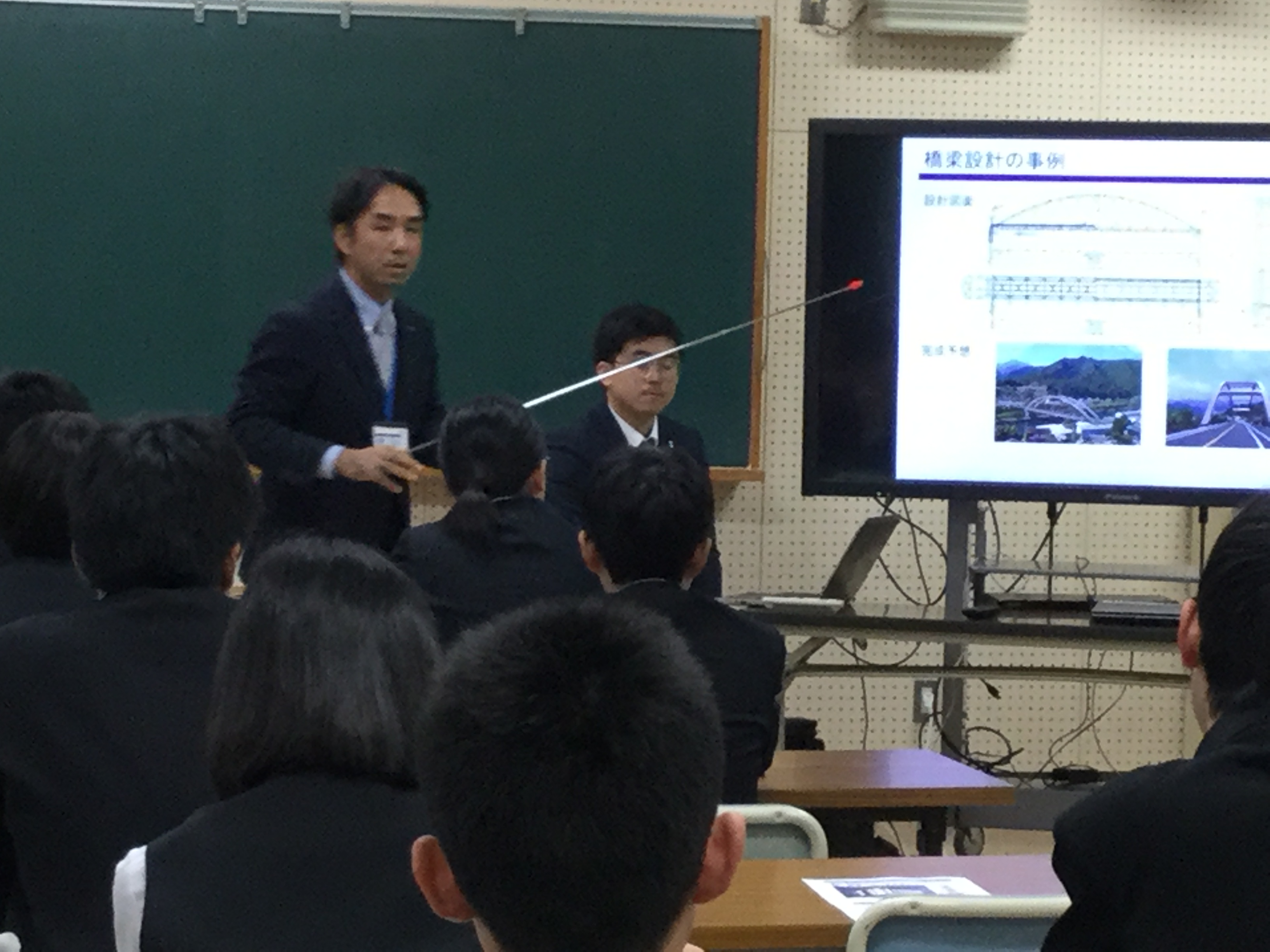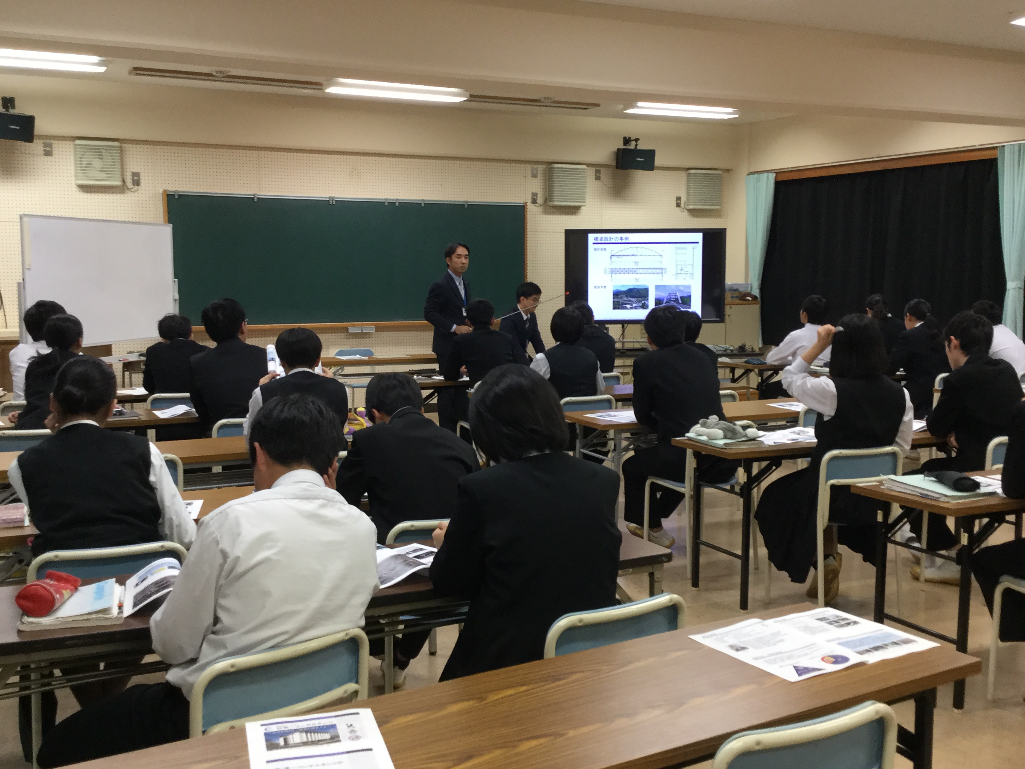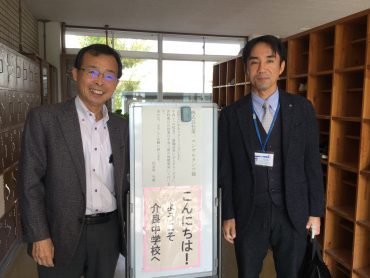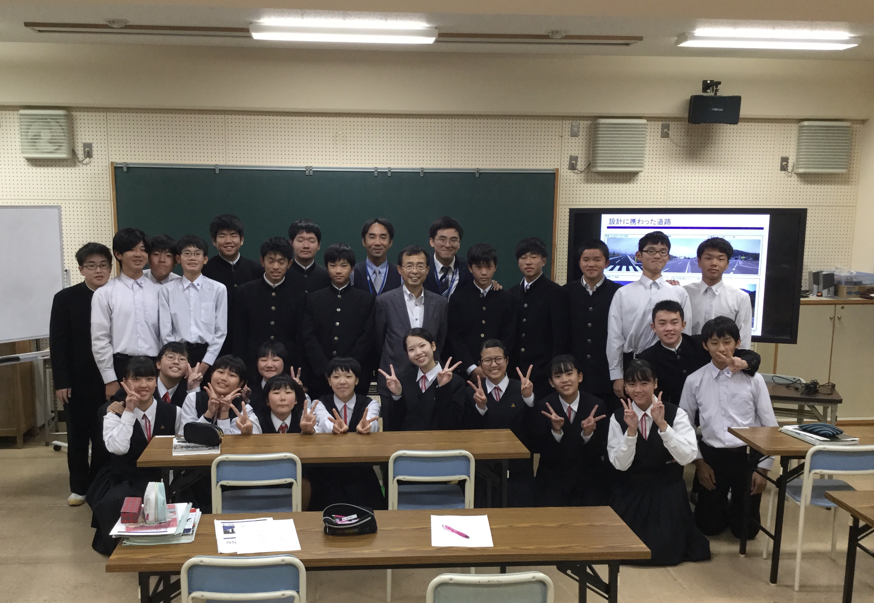 右城社長、設計部の松本取締役部長、設計部防災まちづくり課の金の3人で地元の介良中学校を訪問し、3年1組の生徒に第一コンサルタンツの仕事の内容、取り組み、CSR活動を紹介させていただきました。