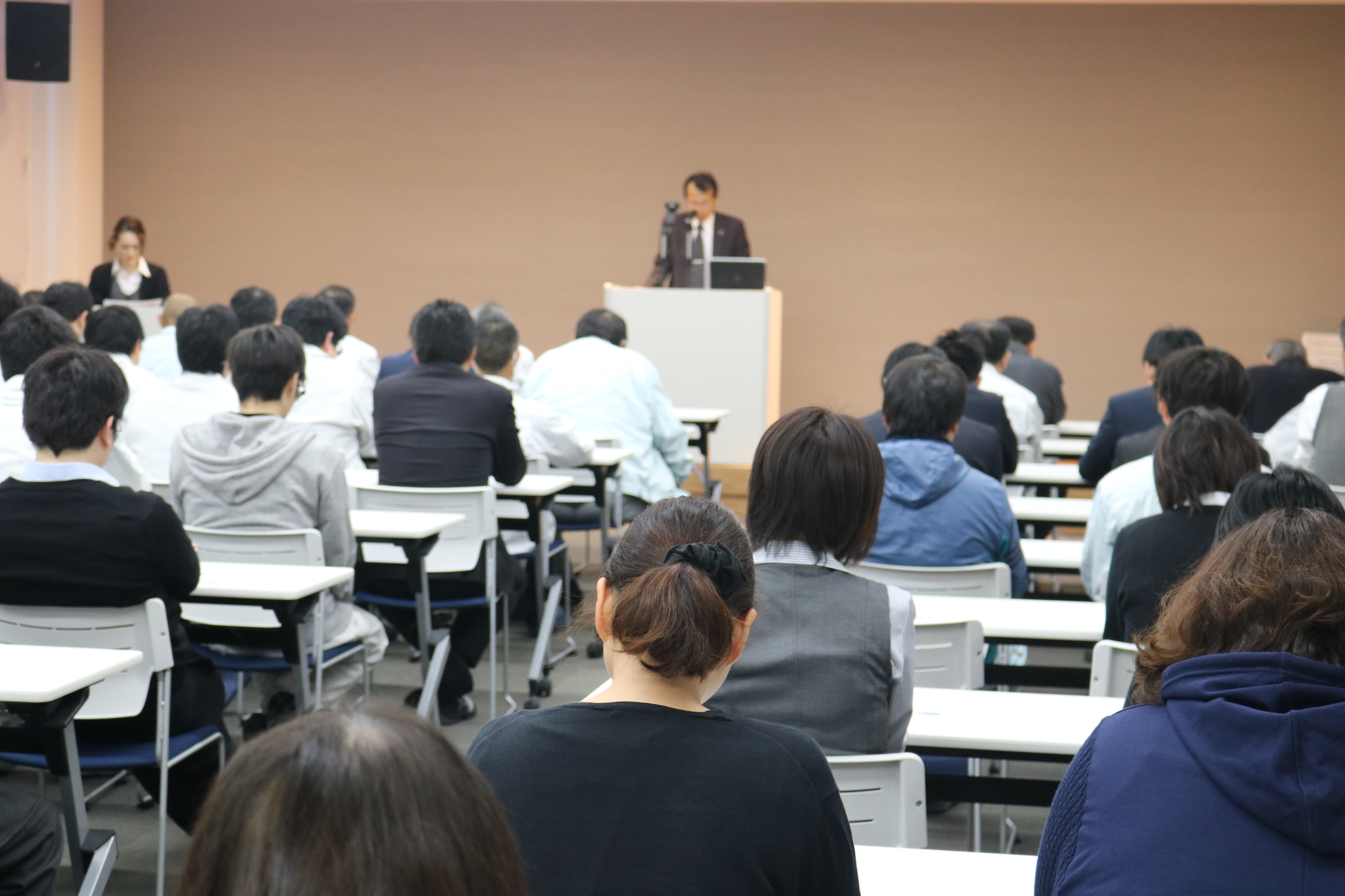 本社社員に一階研修室に集まって頂くとともに、幡多支店、安芸営業所、松山事務所ともWeb会議で繋ぎ、全社にむかって右城社長より会社の歴史や経営理念、創業当時の情熱を再認識しました。社員全員にCLUB HARIEのバームクーヘンを配布し、56周年を祝いました。