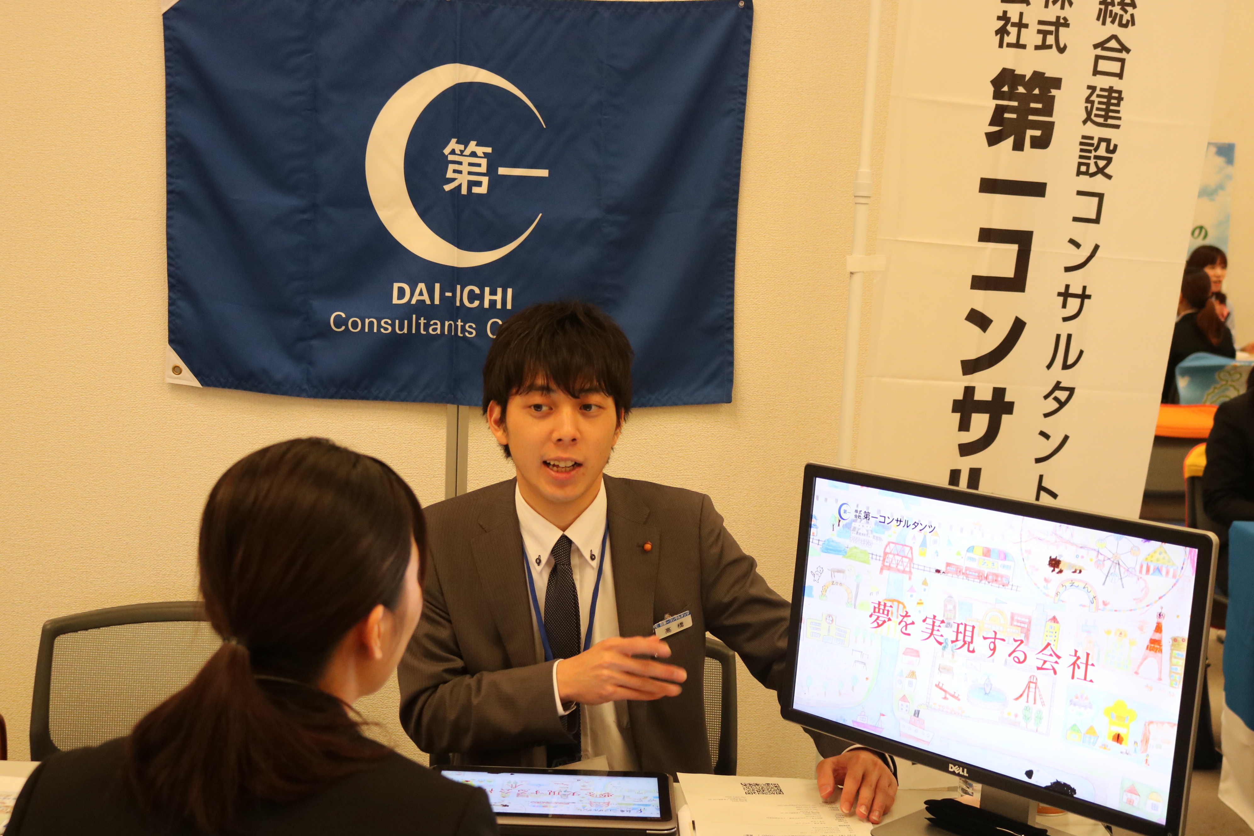 各社3分間の会社紹介スピーチの後、ブースの訪問が始まりました。学生の方の中には、具体的にやりたいことが決まっている学生さんもおり、就職活動への熱意を感じることができました。面談に来て頂いた学生の方、ありがとうございました。