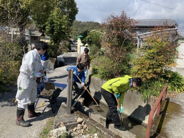 今年も弊社の野球部の部員を中心にした28人が田役に参加し、13時から15時過ぎまで水路に溜まった泥を掻き出した。