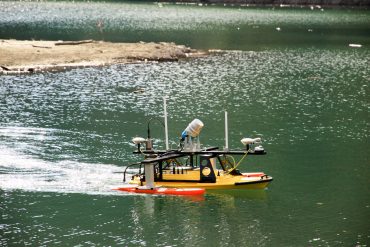 自動航行が可能なリモコンボートに、水中部を計測するナローマルチビームソナーと陸上部を計測するレーザスキャナを搭載し、水陸が一体で計測できるシステムで、直下最大測深は575mです。