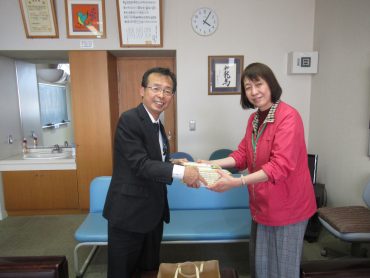 介良潮見台小学校の竹村校長先生に鉛筆を贈呈する右城社長