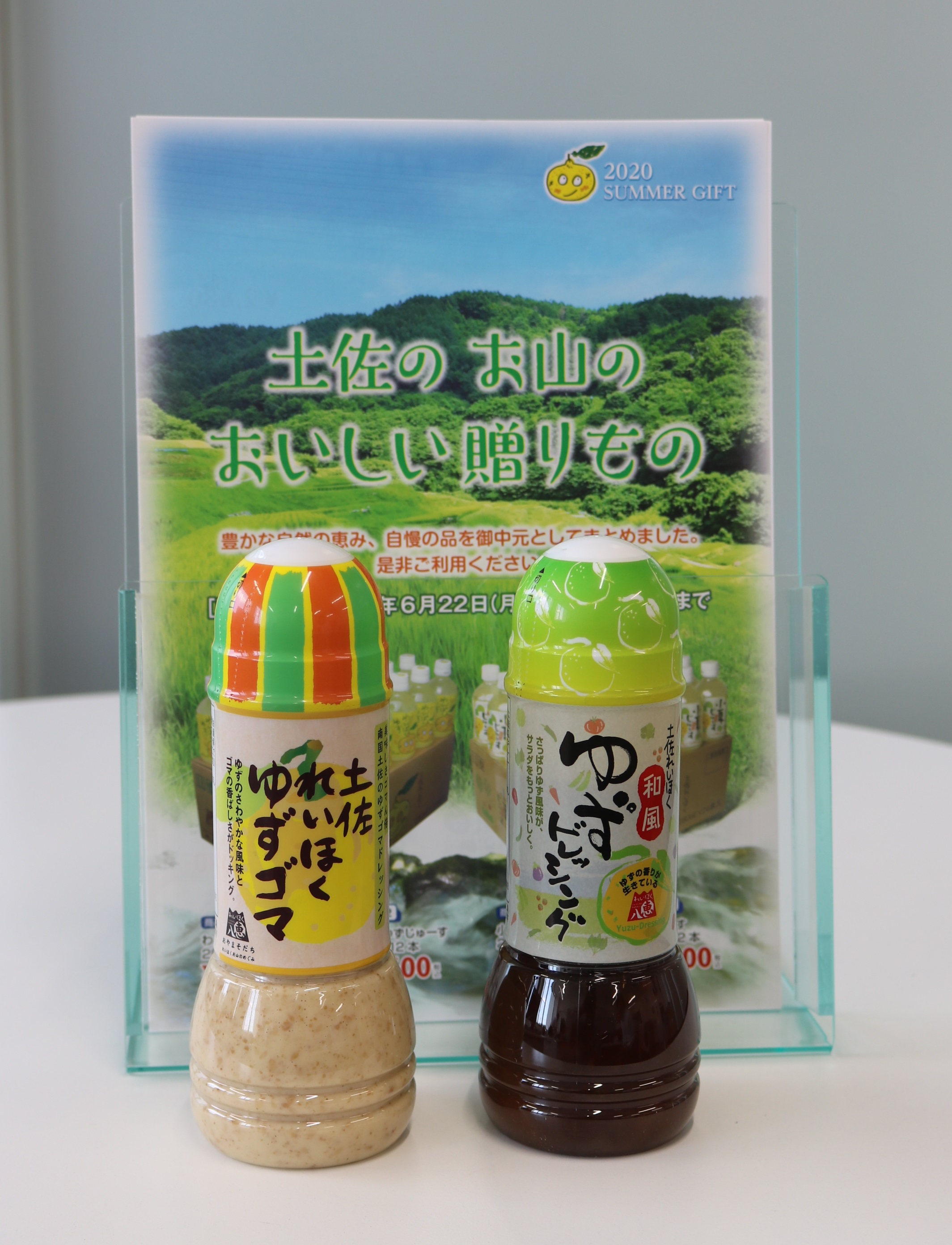 本日、JA高知県れいほく柚子加工場様から、同所より販売している試食用の「ゆずゴマドレッシング」と「和風ゆずドレッシング」をいただき、社員に配布しました。
