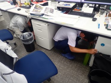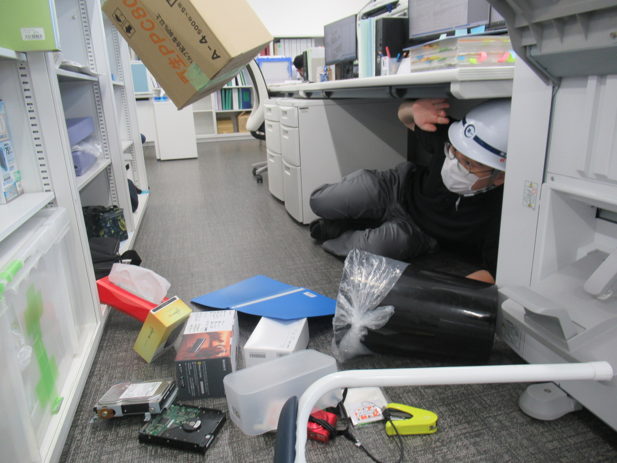 午前10時に社内放送を行い、①姿勢を低く、②頭を守り、③動かない の3つの安全行動を1分間、全員で実施しました。