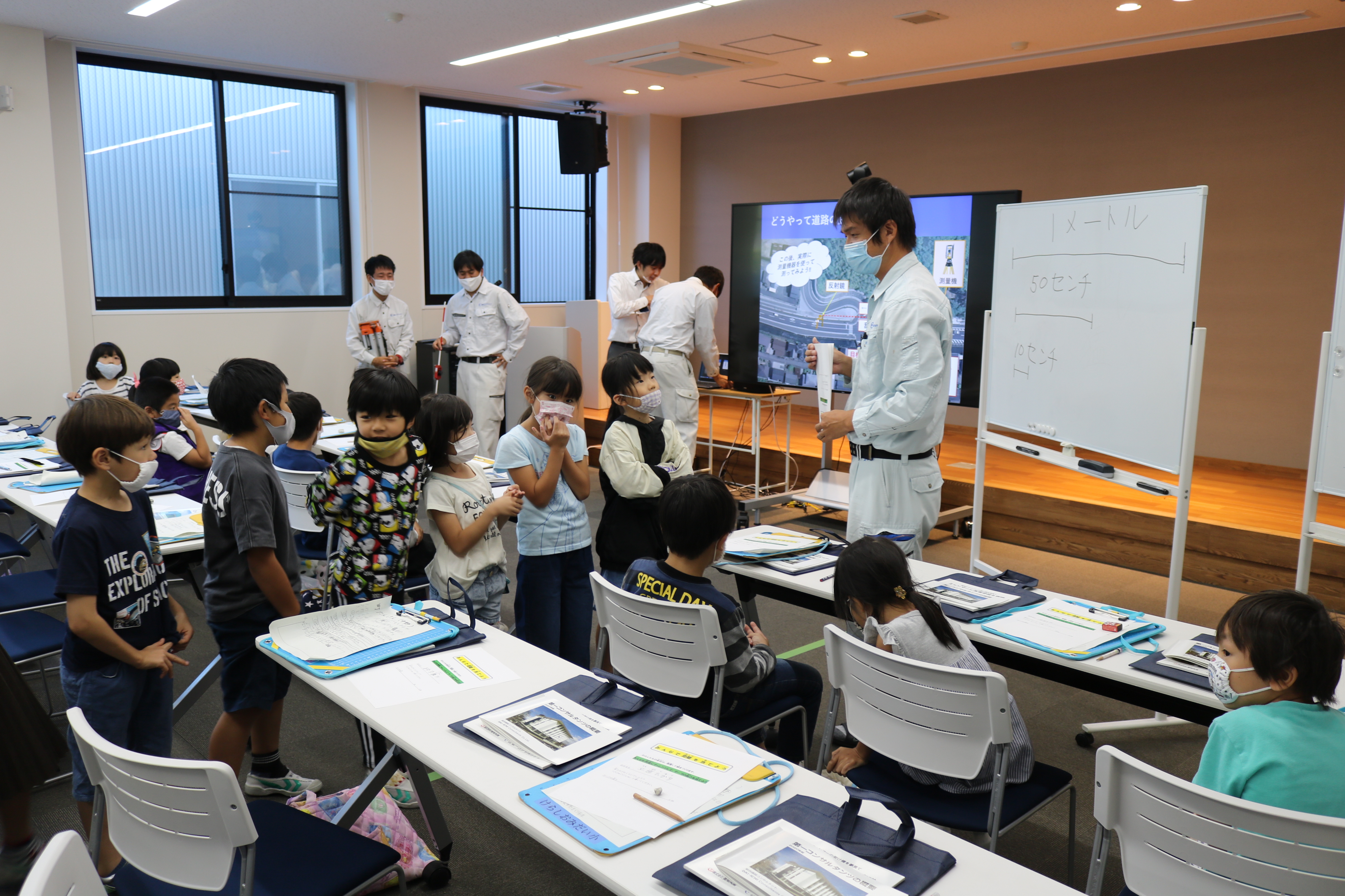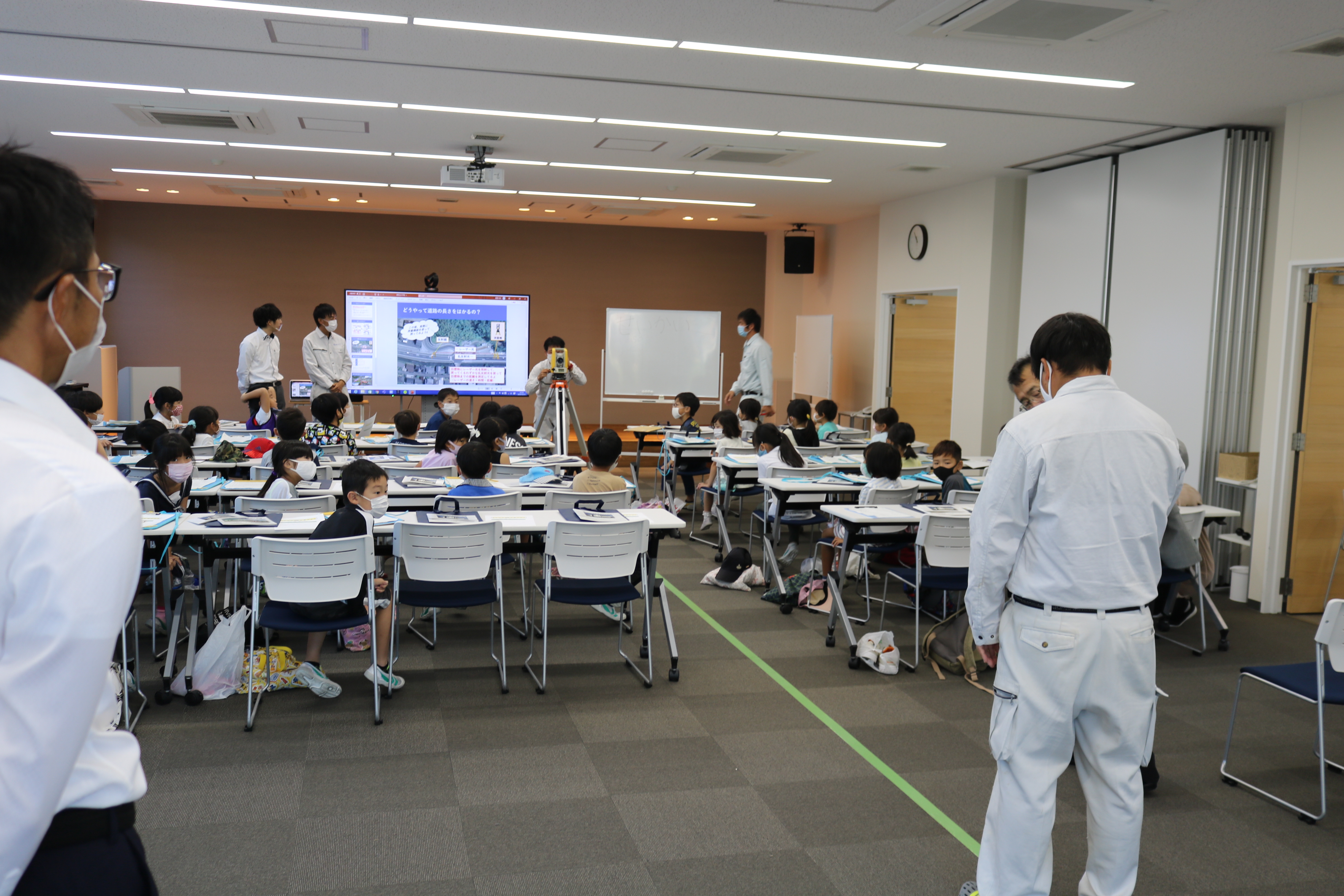 はじめに、子ども達からの挨拶があった後、当社のCMと会社紹介動画を鑑賞して頂きました。当社CMについてはたくさん子ども達から「テレビで見たことある」「映画館で見たことある」といった嬉しい言葉が飛びかっていました。実際には映画館では流れてはいないですが、将来的には流れたらいいなと夢見てます。その後の質問コーナーでは「防災、道路、橋に関する質問」や「社屋に関する質問」などたくさんの質問をして頂き、当社のお仕事について少し興味を持って頂けた様子でした。特に、インフラ整備に関しての質問があったのには驚きました。最後は、子ども達にテープの長さ当てクイズに参加してもらった後、実際に測量機器を使用してその長さを測りました。測量機から反射鏡に発射されるレーザー光(安全には十分配慮して行っております)に子ども達は興味津々でした。