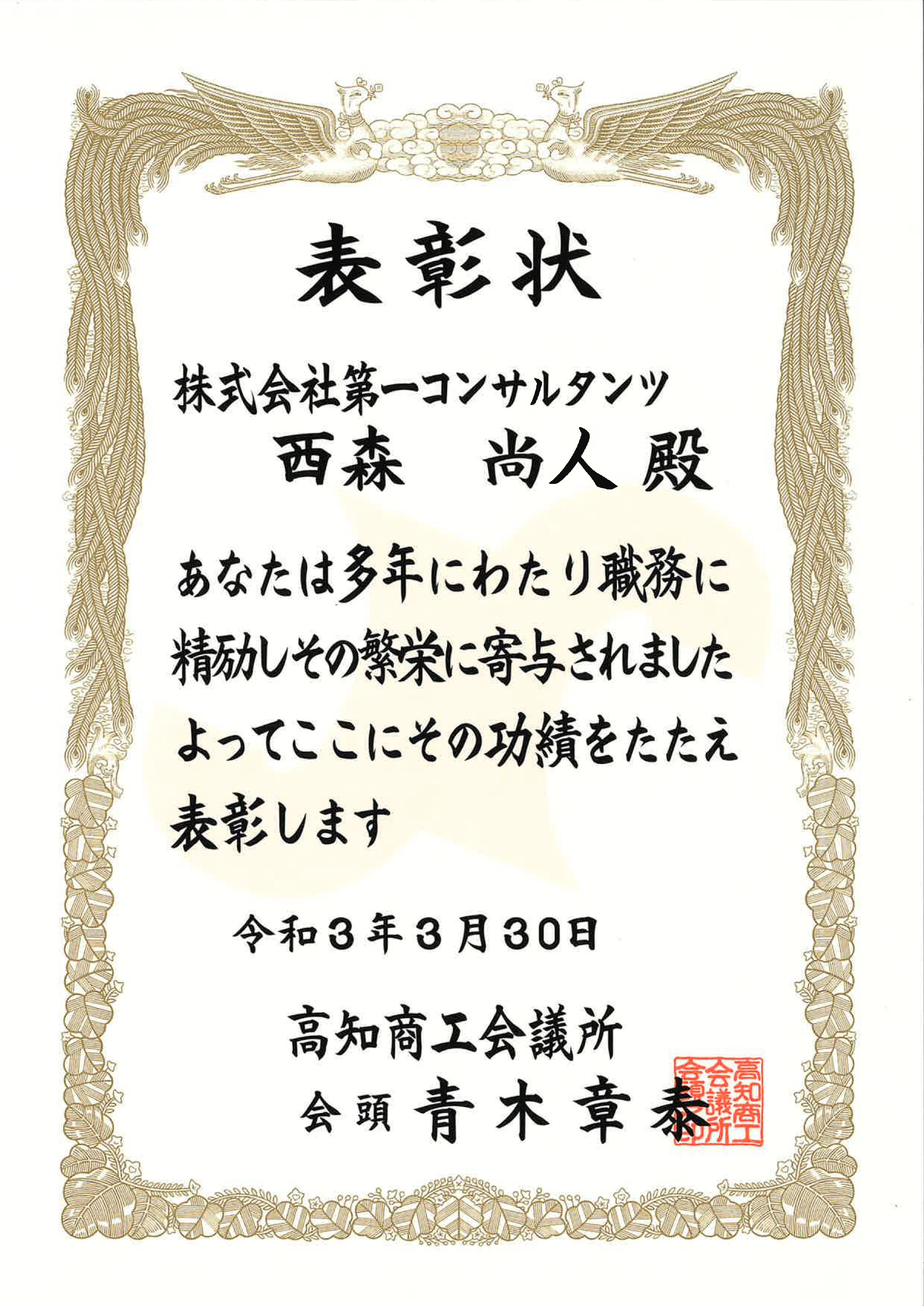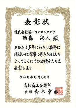当社も当表彰式に参加しており、今年度は➁の理由により、調査補償課 西森 尚人さんを推薦致しました。表彰式は同日、高知商工会議所で行われました。