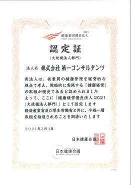 3月4日付けで、当社は経済産業省が行う2021年度の「健康経営優良法人認定制度」の大規模法人部門に認定されました。