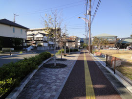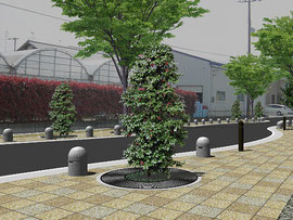 高知市が進める弥右衛門土地区画整理事業の一環として、土地区画内の道路である、弥右衛門アメニティロード線の道路設計を行いました。安全で快適な歩行空間を確保するために、歩道内に休憩スペースを確保し、東屋やベンチを設置したほか、自動車の速度を低下させるために車道の線形を波形にするなどの工夫をしました。そのほか、舗装、照明施設、植栽などについても、景観に配慮した計画を行いました。
