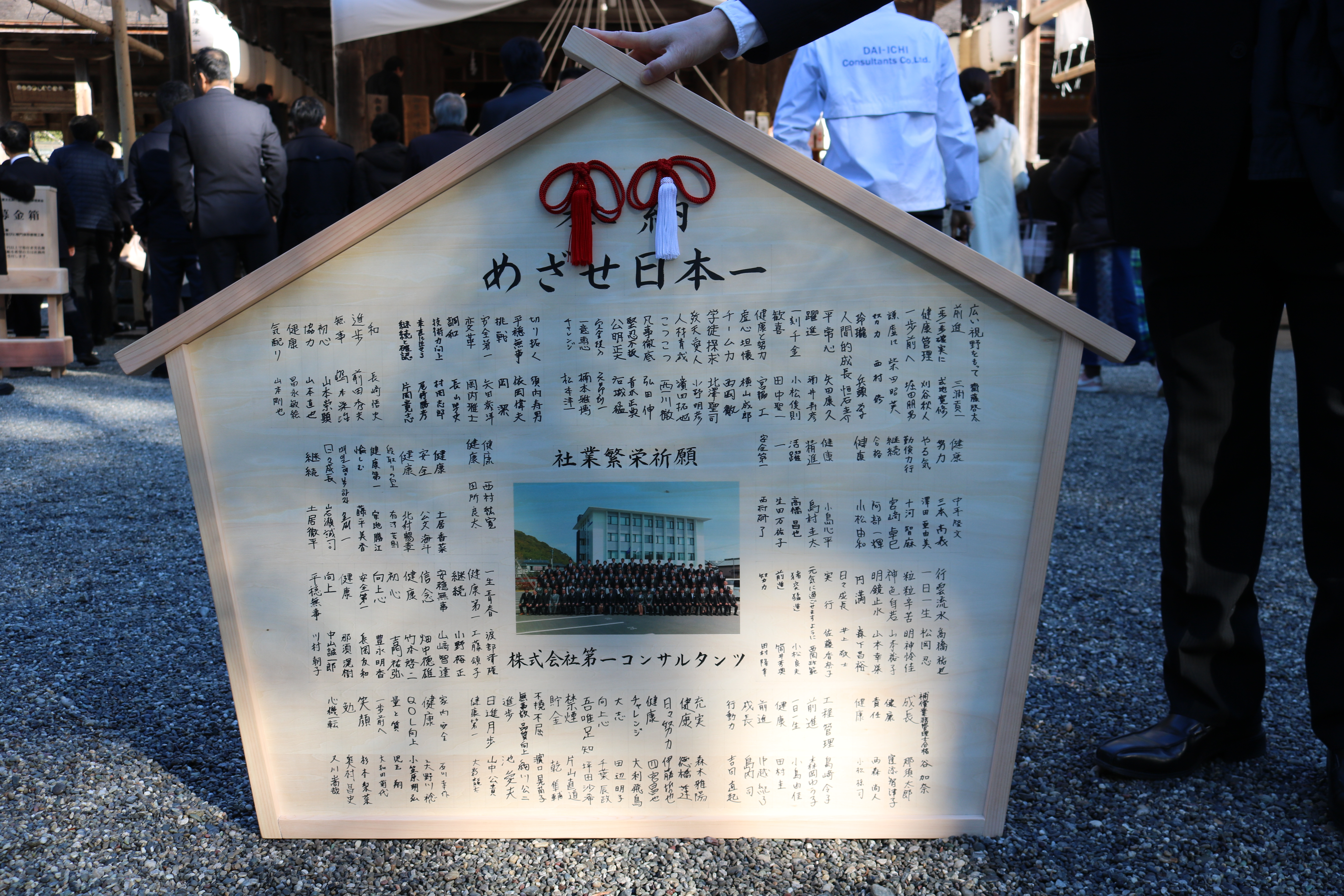 社長の右城による年頭の挨拶の後、毎年恒例となった巨大絵馬に社員の抱負を込めて中堅社員~幹部社員で土佐神社に参拝し、社内安全・社業繁栄の祈願と絵馬を奉納致しました。