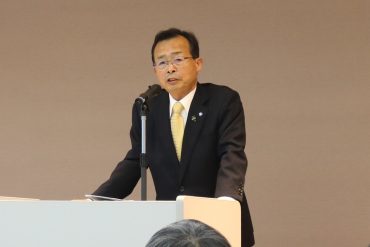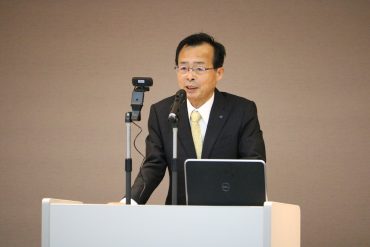社長の右城による年頭の挨拶の後、毎年恒例となった巨大絵馬に社員の抱負を込めて